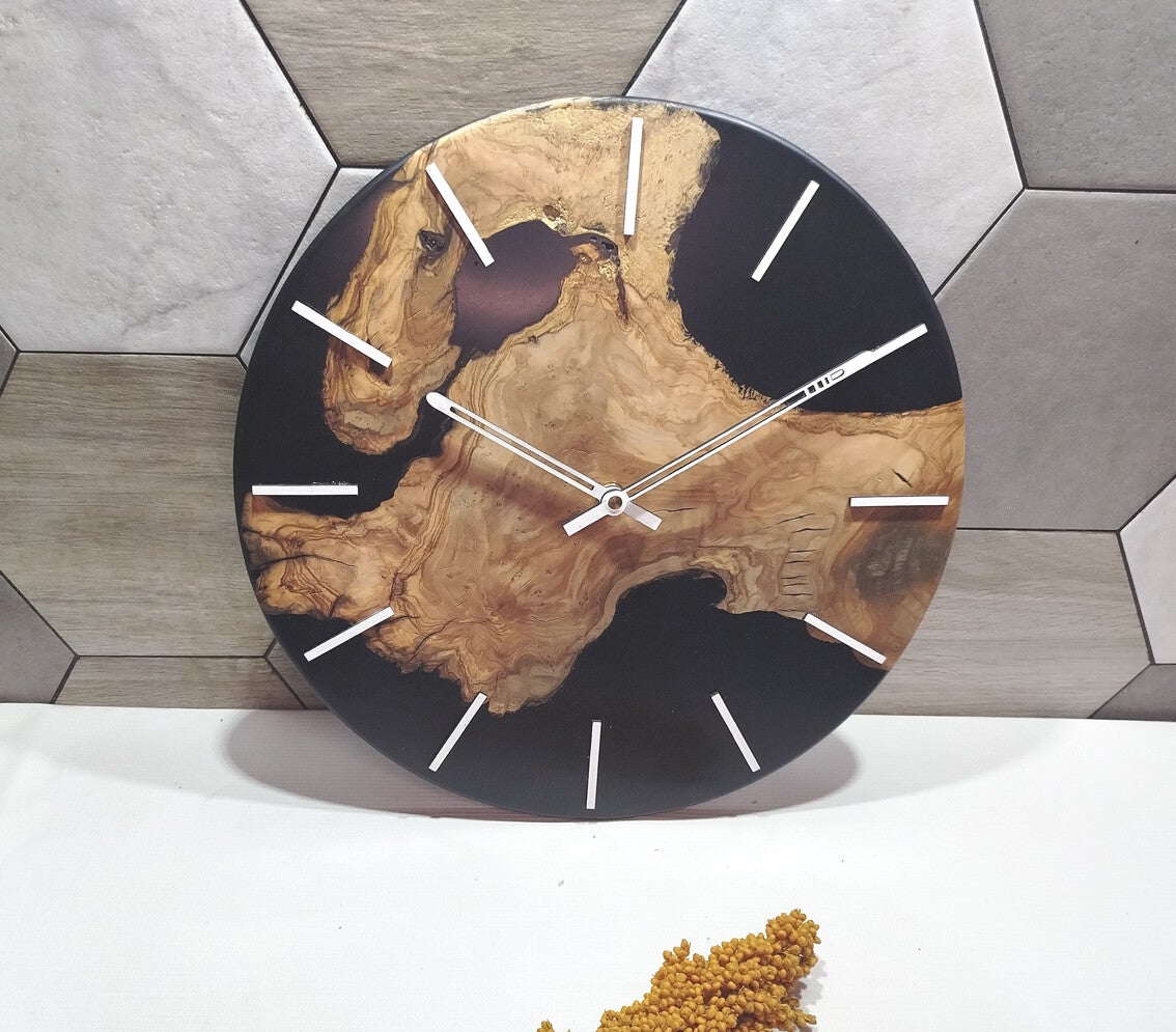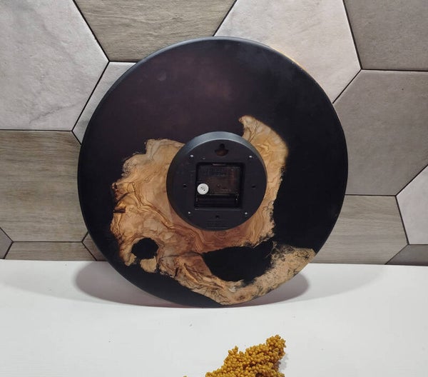 Horloge en racine d'Olivier de Sicile, résine époxy noire brillant